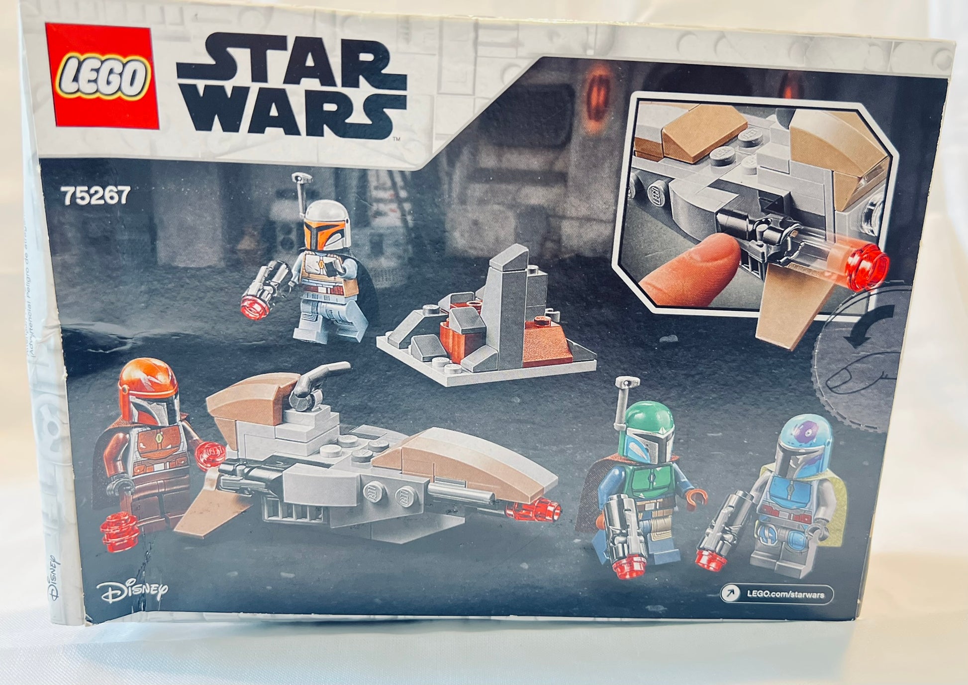 LEGO 75267 Mandalorian Battle Pack was a 102 piece Star Wars set with 4 minifigs released in 2020. It consists of four Mandalorian warrior minifigures (2 male Mandalorian Tribe Warriors and 2 female Mandalorian Tribe Warriors), a defense fort, and a speeder bike with stud shooters.