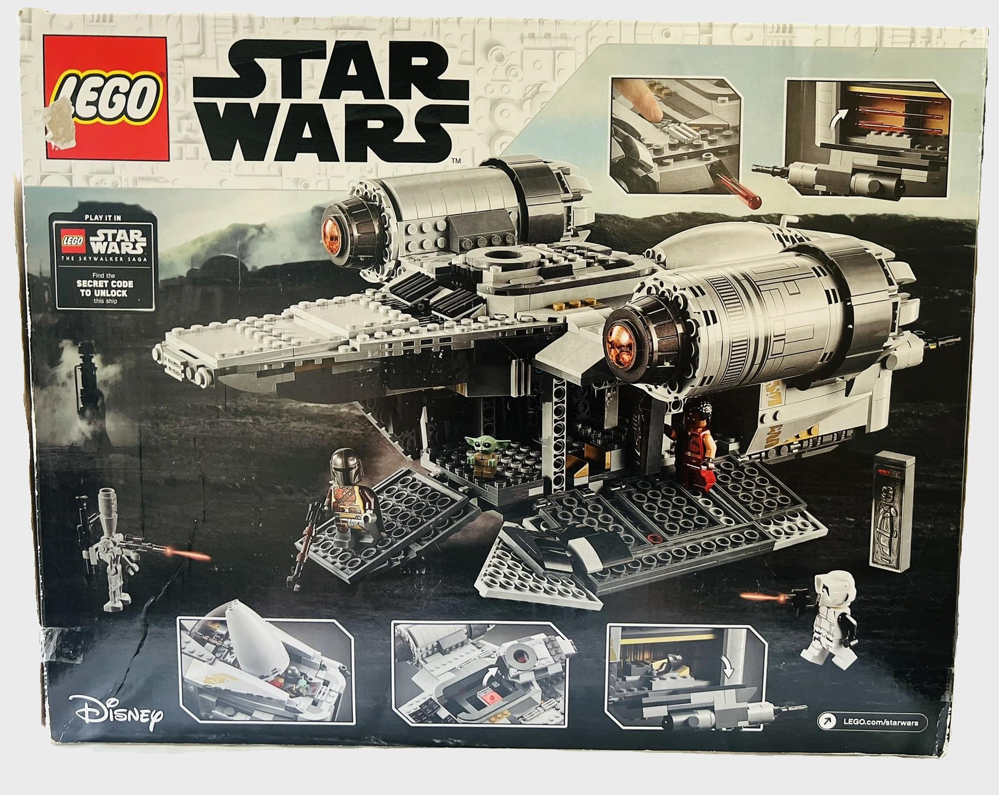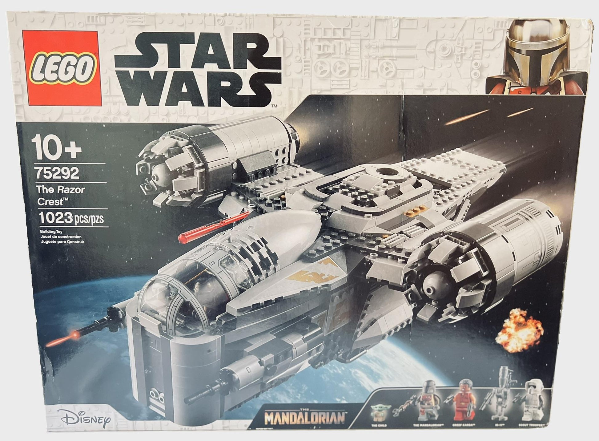 LEGO 75292 The Razor Crest is a 1,023 piece Star Wars set with 5 minifigs released in 2020. It includes the Mandalorian, Greef Karga, Scout Trooper and the Child and an IG-11 minifigure as well as The Razor Crest ship. The European version of the set is called The Mandalorian Bounty Hunter Transport due to copyright issues. It was retired in November 2023 with a lifespan of 38 months.