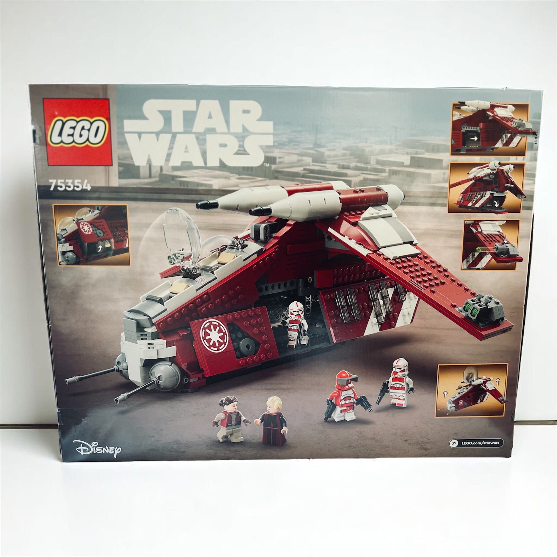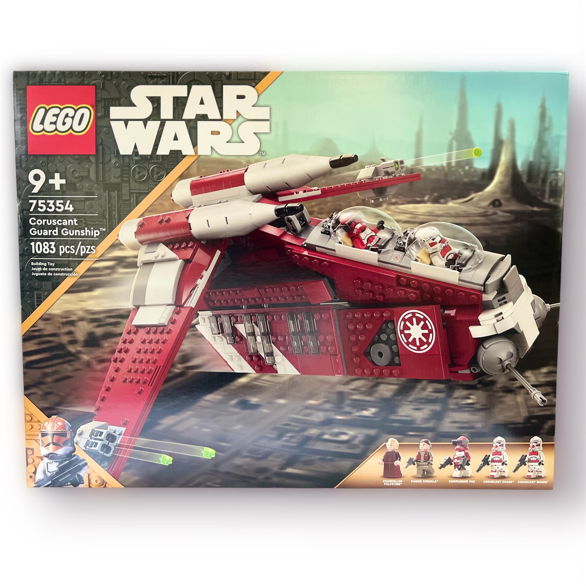 LEGO 75354 Coruscant Guard Gunship is a 1,083 piece Star Wars set with 5 minifigs released in 2023. It features two pilot cockpits, two adjustable cannons, a handle for flying, a rear hatch, sliding side panel, and space for troopers. It includes five minifigures: Commander Fox, Chancellor Palpatine, Padmé Amidala. It is based off the Clone Wars animated series.