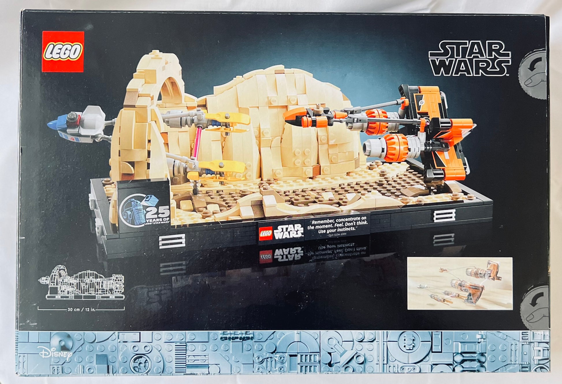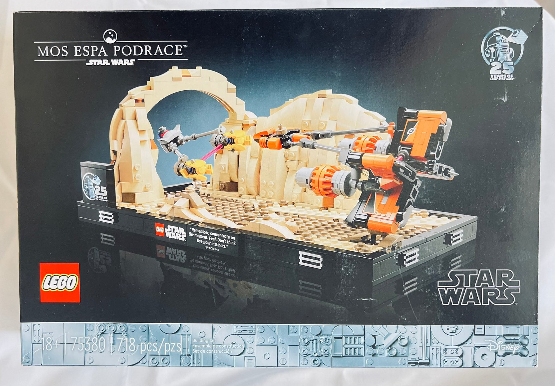 LEGO 75380 Mos Espa Podrace is a 718 piece Star Wars set released in 2024. It consists of micro-scale diorama of Anakin and Sebulba's Podracers, a display base, ta an backdrop for Tattooin, a 25th anniversary plaque, and a printed quote from Qui-Gon. Also called "Boonta Eve Podrace Diorama"