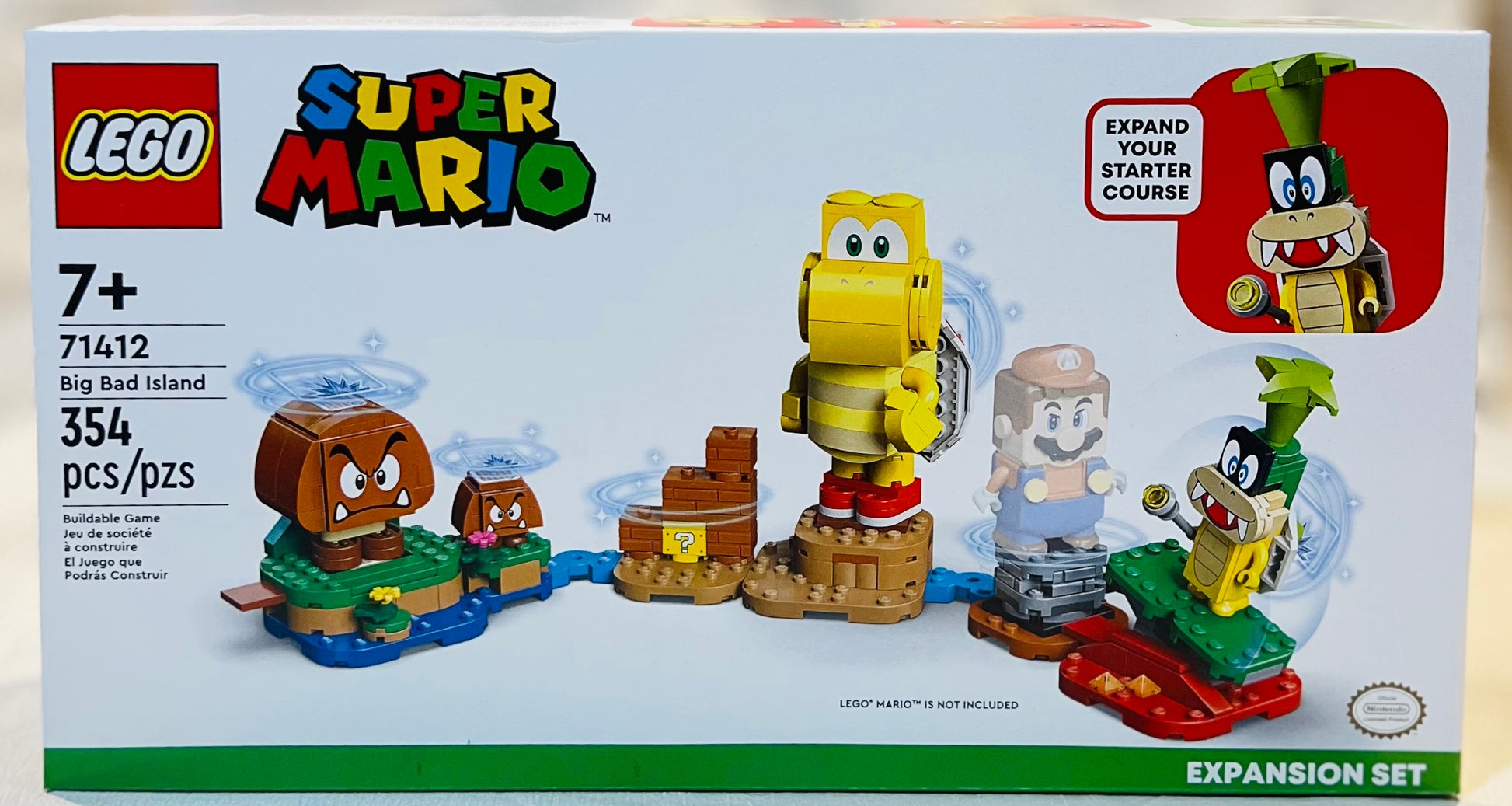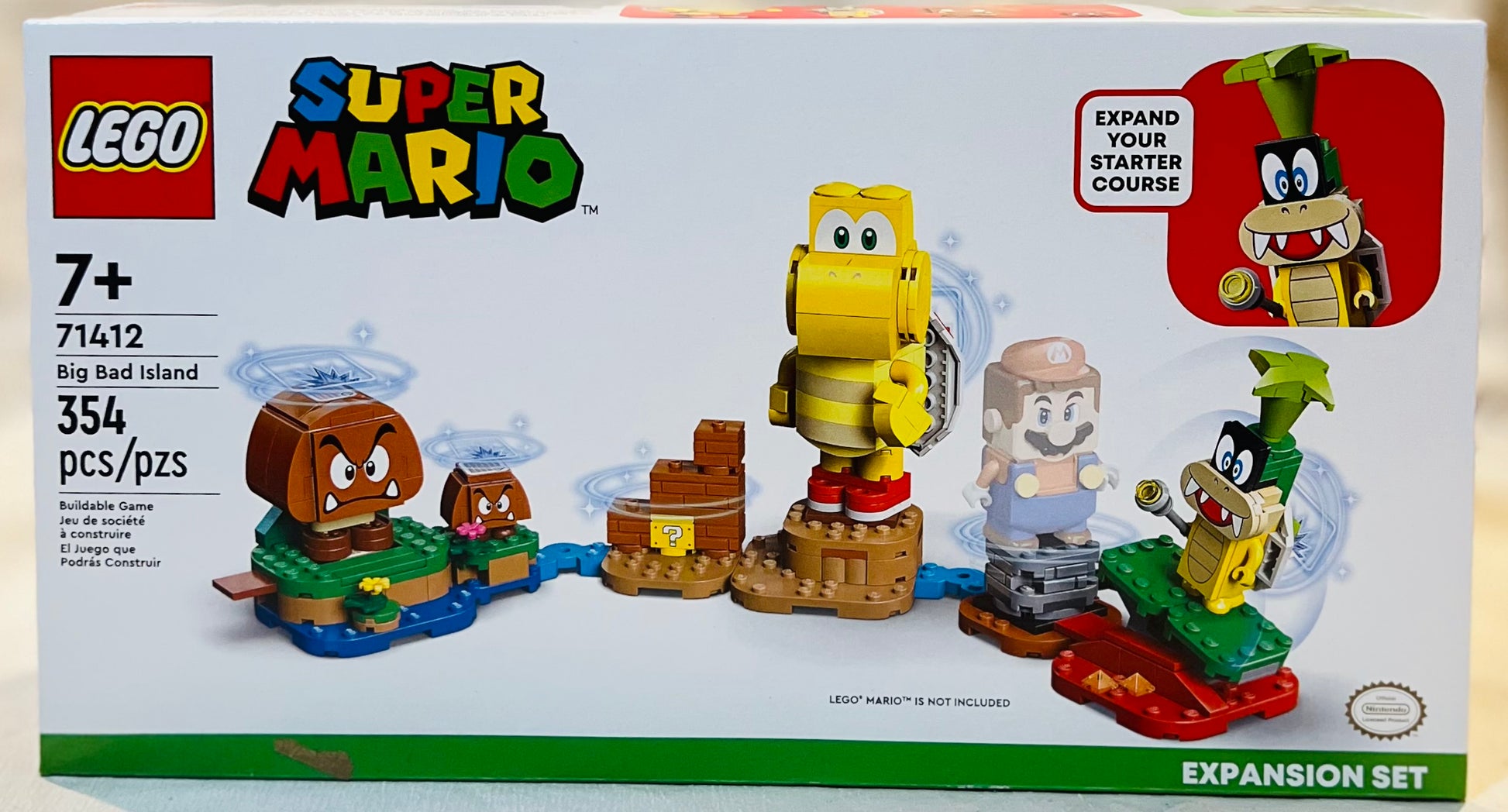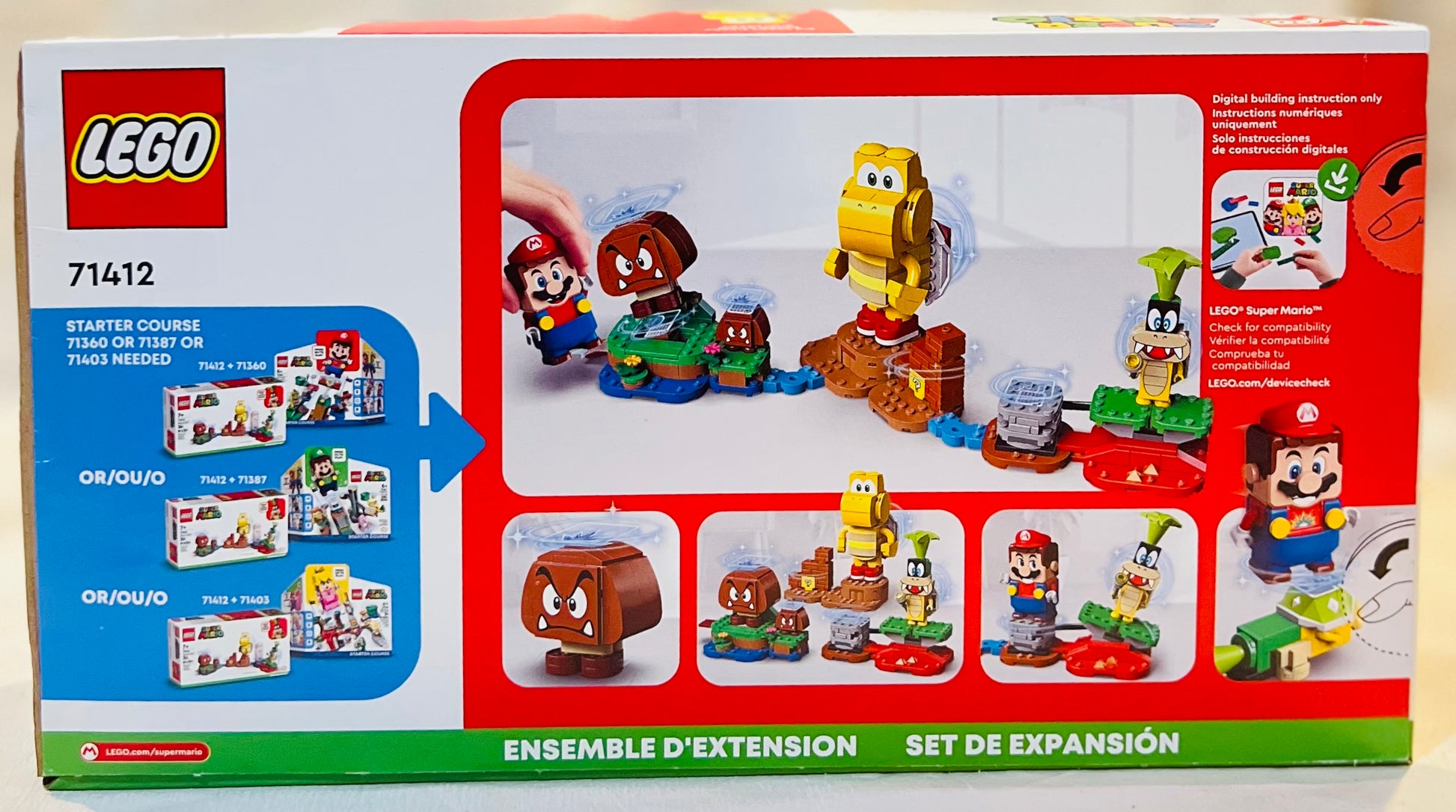 Kids can build a Big Bad Island with big enemy characters with this LEGO Super Mario Expansion Set (71412). The buildable toy for kids aged 7+ years old will bring extra play possibilities to your kids LEGO Super Mario starter course (71360 with LEGO Mario, 71387 with LEGO Luigi or 71403 with LEGO Peach) which is required for interactive fun. The Super Mario buildable toy includes 3 new-for-August-2022 LEGO Super Mario figures: Iggy, a Big Koopa Troopa and a Big Goomba (plus a normal-size Goomba figure). Each has a brick-built display stand, which youngsters can connect for interactive play with their LEGO Mario, LEGO Luigi or LEGO Peach figures (not included). Fun features include a hidden ? Block offering various rewards, a launcher to send the Big Goomba flying and a seesawing challenge to topple Iggy. This Super Mario buildable toy makes a fantastic gift for kids aged 7 and over. Also, check out the LEGO Super Mario app for building instructions, inspirational ideas and more to boost your kids' creative experience. Modular LEGO Super Mario Starter Courses and Expansion Sets allow fans to expand, rebuild and create their own unique levels for digital coin-collecting play. Measuring over 5.5 in. (14 cm) high, 13.5 in. (35 cm) wide and 6 in. (16 cm) deep in its basic formation, this modular set mixes with other LEGO Super Mario toy playsets. Contains 354 Pieces.