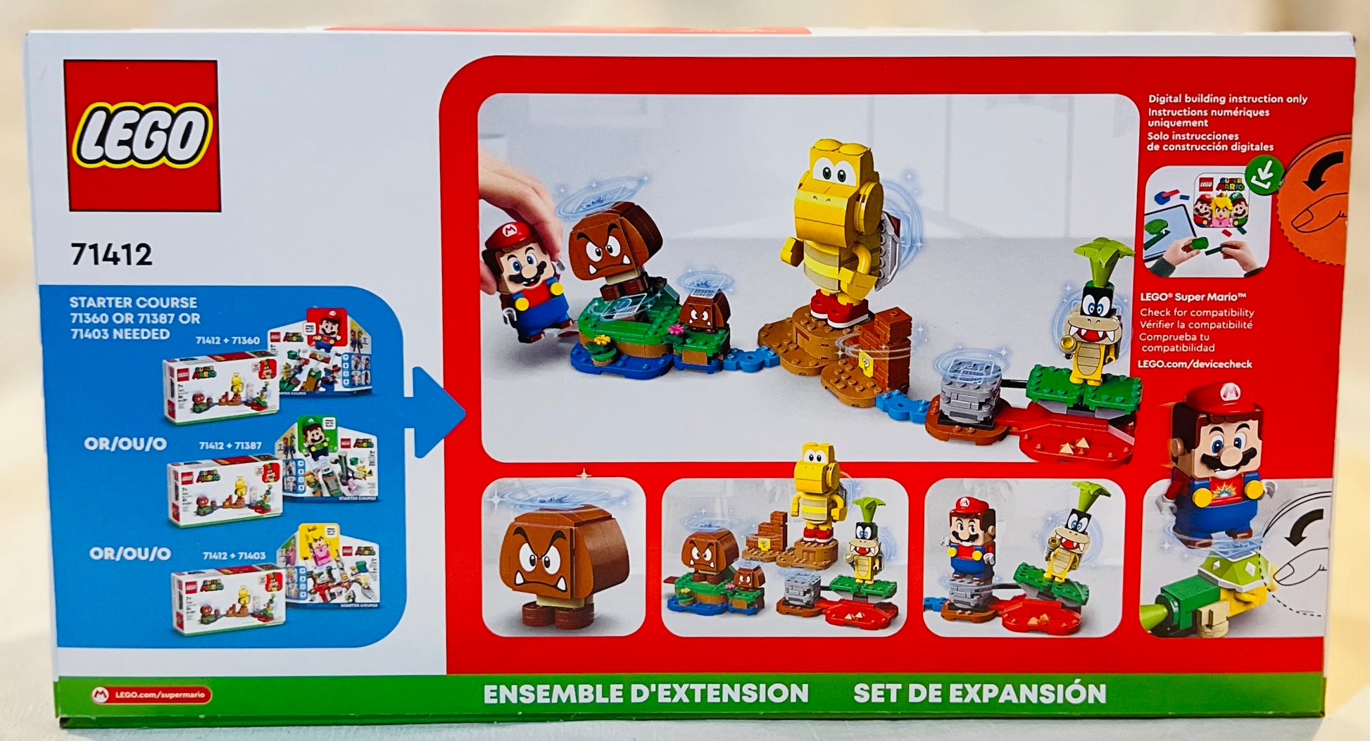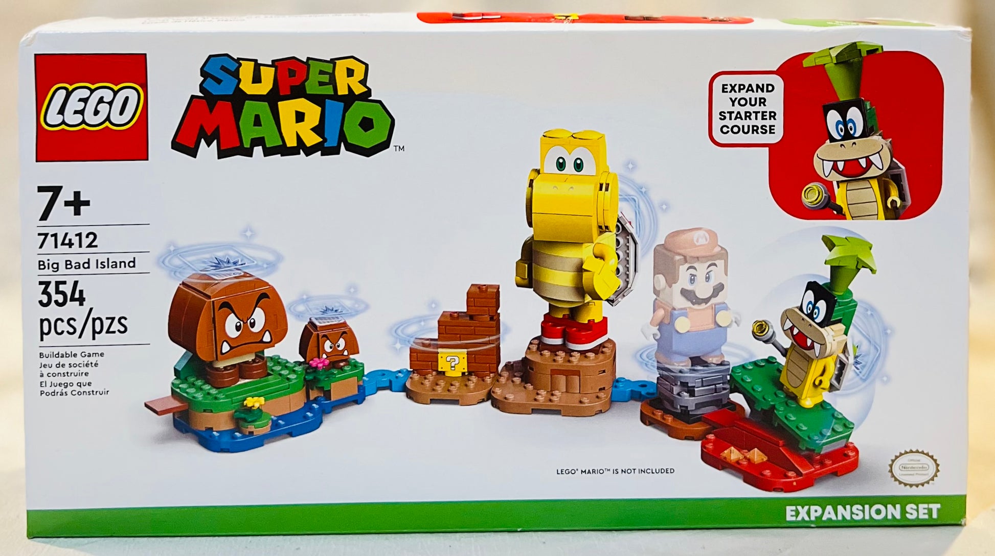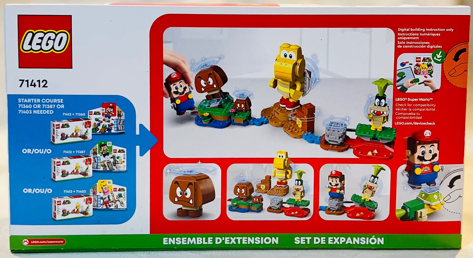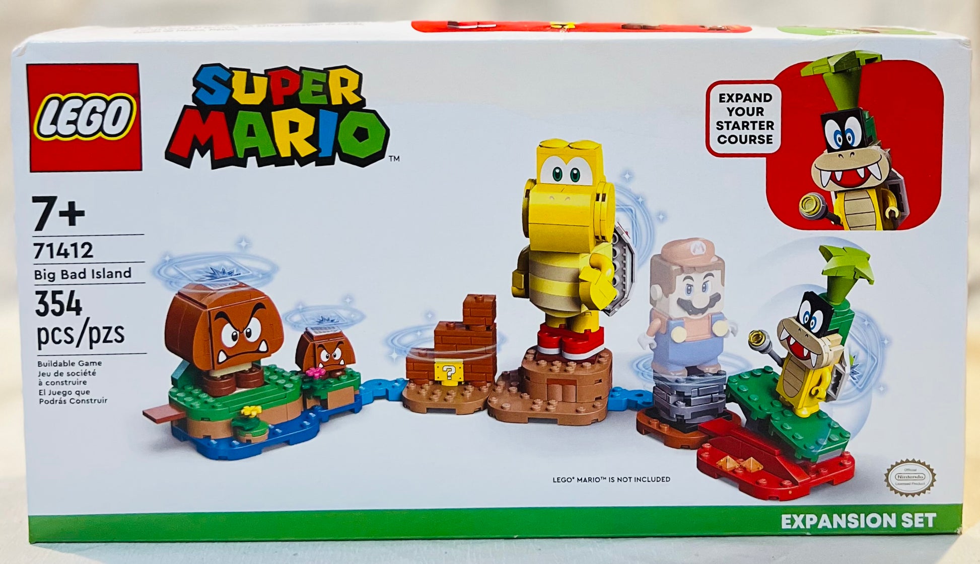 Kids can build a Big Bad Island with big enemy characters with this LEGO Super Mario Expansion Set (71412). The buildable toy for kids aged 7+ years old will bring extra play possibilities to your kids LEGO Super Mario starter course (71360 with LEGO Mario, 71387 with LEGO Luigi or 71403 with LEGO Peach) which is required for interactive fun. The Super Mario buildable toy includes 3 new-for-August-2022 LEGO Super Mario figures: Iggy, a Big Koopa Troopa and a Big Goomba (plus a normal-size Goomba figure). Each has a brick-built display stand, which youngsters can connect for interactive play with their LEGO Mario, LEGO Luigi or LEGO Peach figures (not included). Fun features include a hidden ? Block offering various rewards, a launcher to send the Big Goomba flying and a seesawing challenge to topple Iggy. This Super Mario buildable toy makes a fantastic gift for kids aged 7 and over. Also, check out the LEGO Super Mario app for building instructions, inspirational ideas and more to boost your kids' creative experience. Modular LEGO Super Mario Starter Courses and Expansion Sets allow fans to expand, rebuild and create their own unique levels for digital coin-collecting play. Measuring over 5.5 in. (14 cm) high, 13.5 in. (35 cm) wide and 6 in. (16 cm) deep in its basic formation, this modular set mixes with other LEGO Super Mario toy playsets. Contains 354 Pieces.